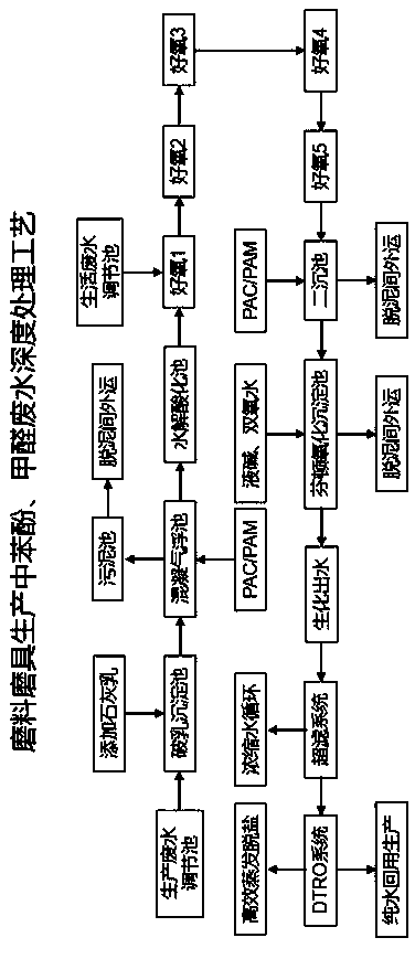 2.根据权利要求1所述的磨料磨具生产中酚醛树脂废水的深度处理工艺,其特征在于:所述磨料磨具生产中酚醛树脂废水的主要来源:a、原布处理废水,废水主要成分为悬浮物、淀粉、PVA和少量碱液;甲醛含量在10mg/L,苯酚含量480mg/L,COD含量760mg/L;