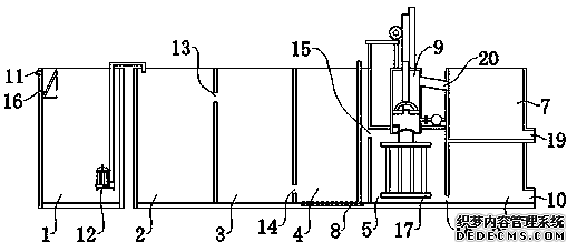 所述膜生物反应池(5)内设置有MBR膜反应器(17),所述抽水通道(906)下端与所述MBR膜反应器(17)出口连通,上端与所述抽水腔(901)底部连接,所述下密封盘(907)安装在所述抽水腔(901)底部且用于封闭所述抽水通道(906),所述下密封盘(907)活动连接在所述抽水腔(901)上,所述下驱动气缸(908)用于带动所述下密封盘(907)在所述抽水腔(901)上转动,以使所述抽水通道(906)打开或关闭;
