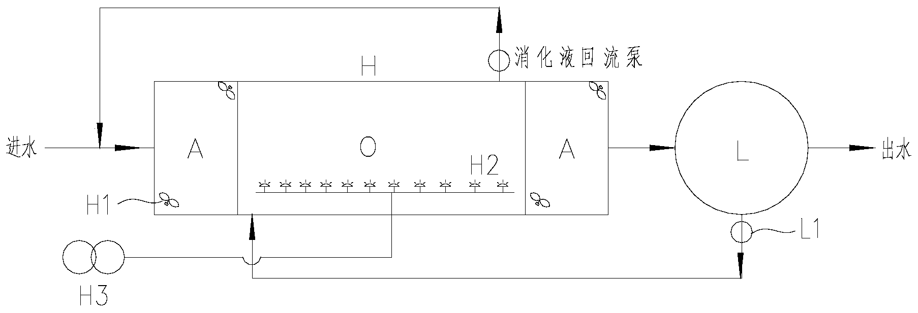 将原污水引入封闭罐体内位于导流伞上侧的缺氧区或好氧区,在深水浅曝单元的曝气作用下,好氧区水中空气含量增加,密度降低,在好氧区和缺氧区、厌氧区之间造成压差,使污水形成立体循环流动,缺氧区的缺氧污水在重力作用下,向下流动,溶氧减少,至缺氧厌氧区的下部变为厌氧区进行厌氧生化,厌氧区的厌氧污水回流进入好氧区进行曝气,以对污水进行缺氧-厌氧-好氧的生化处理;