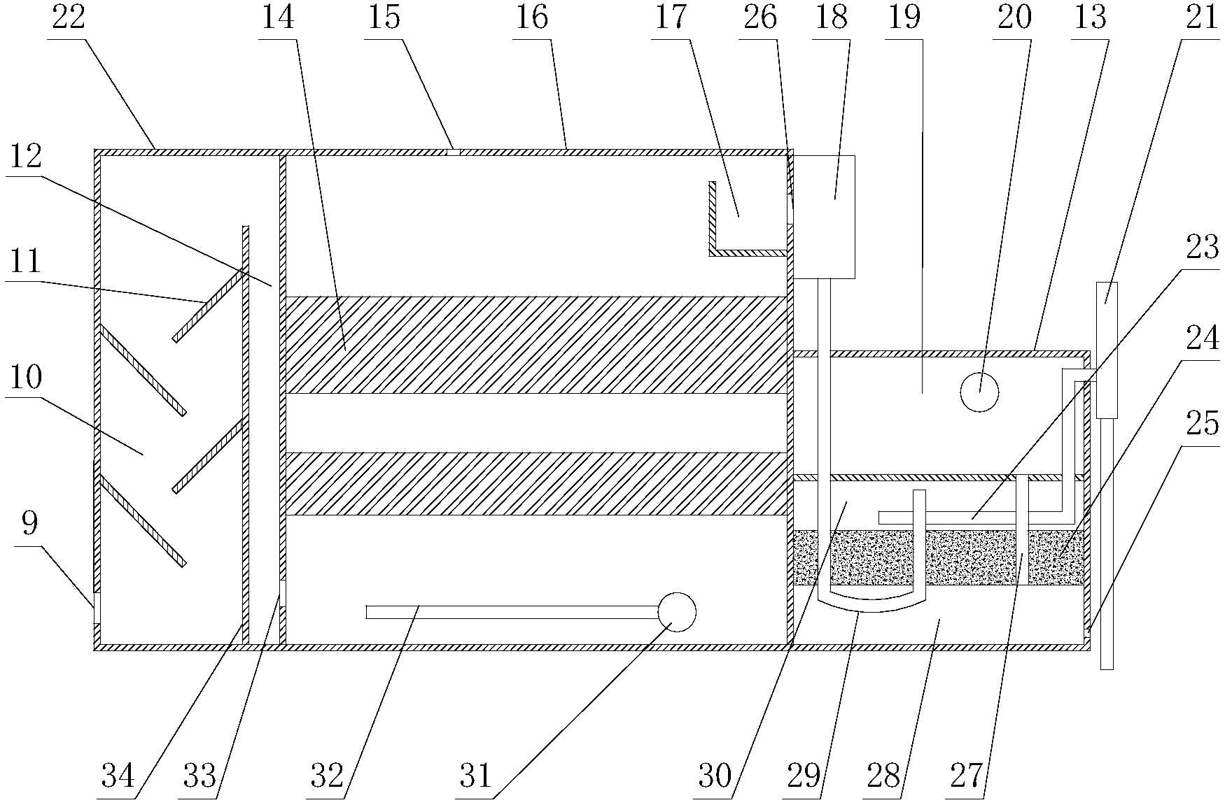 2.本专利所述污水处理装置包括絮凝箱、沉淀箱、过滤箱;所述絮凝箱设有与所述混合器相连的进水口,所述过滤箱设有与所述清水池相连的出水口;所述沉淀箱设有沉淀填料;通过有高效沉淀效果沉淀填料的沉淀箱使水中聚并成大颗粒的杂质下沉,与水分离而使水质得到净化,沉淀出水中仍有少量细小颗粒杂质,再采用过滤箱过滤,进一步去除水中悬浮物,实现较彻底的清除。
