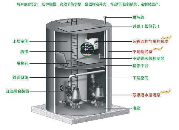 一体化预制泵站是一种集潜水泵、泵站设备、除污格栅设备、控制系统及远程监控系统集成的一体化的产品。主要用于收集和排放住宅小区、饭店、学校、工厂、部队营房和其它公共场所的污水废水等,其特点具有机动灵活,泵站建设周期极短,安装极其简便。目前在国内市政行业成为一个新的泵站建设发展趋势。